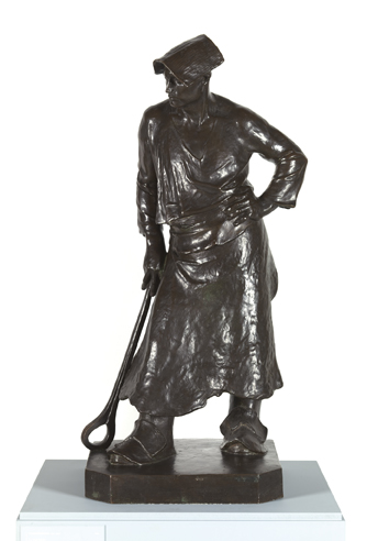 Constantin Meunier (żyjący w latach 1831-1905), jeden z najważniejszych artystów belgijskich II połowy XIX stulecia, był zarówno malarzem jak i rzeźbiarzem. Swą artystyczną edukację rozpoczął Zachęcony przez starszego brata, rytownika Jeana Baptiste Meuniera. W Akademii Sztuk Pięknych w Brukseli, do której wstąpił w 1845 roku, kształcił się pod okiem Louisa Jehotte’a, następnie zaś kontynuował edukację w prywatnym studio Charlesa-Auguste’a Fraikina. Pierwsze dziesięciolecia jego artystycznej działalności po ukończeniu studiów były poświęcone malarstwu. Jego prace wpisują się w nurt realizmu, tematycznie zaś ogniskują się wokół scen z życia niższych warstw społecznych ówczesnej Belgii. Choć w swoich czasach artysta odniósł sukces jako malarz, to jednak w historii sztuki i kultury zapisał się w pierwszej kolejności jako rzeźbiarz. Po 1880 roku, przekroczywszy pięćdziesiątkę, Meunier powrócił bowiem do aktywności, na której był skoncentrowany w czasie studiów. Co więcej, zaczął tworzyć dzieła doskonale odpowiadające potrzebom epoki, jak też celnie ją definiujące. W latach 80. zaczęły powstawać różnej wielkości, odlewane głównie w brązie, przedstawienia robotników, ukazywanych realistycznie, z pietyzmem, jednocześnie zaś z wyraźnie dostrzegalnym pierwiastkiem idealizacji, heroizacji.