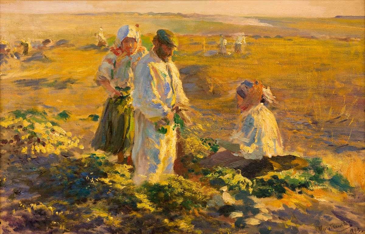 Płótno Kopanie buraków z Galerii Malarstwa w Sukiennicach, oddziału Muzeum Narodowego w Krakowie, powstało w 1893 roku podczas jednej z wielu wizyt artysty w Ukrainie i na Podolu. Wyczółkowski dobrze poznał ten region podczas wizyt w latach od 1883 do 1911 roku, zwiedzał różne okolice będąc gościem w magnackich domach. Praca w polu była jednym z najczęściej podejmowanych motywów. To, co przede wszystkim interesowało artystę we wschodnim pejzażu to bezkresne stepy, ciepły odcień ziemi, kolorowe stroje chłopów. Parafrazując słowa Wyczółkowskiego, uważał wyjazd do Ukrainy jako przełom w swoim życiu i twórczości. To czas, kiedy na zawsze porzucił przyzwyczajenia ze szkół, w których pobierał nauki, a odnalazł swój własny styl malarski. To ważny temat również w duchowości artysty, który zamiast szukając wzniosłych tematów w dziejach Polski, zaczął ich szukać wśród wiejskiej ludności i jej ciężkiej pracy.