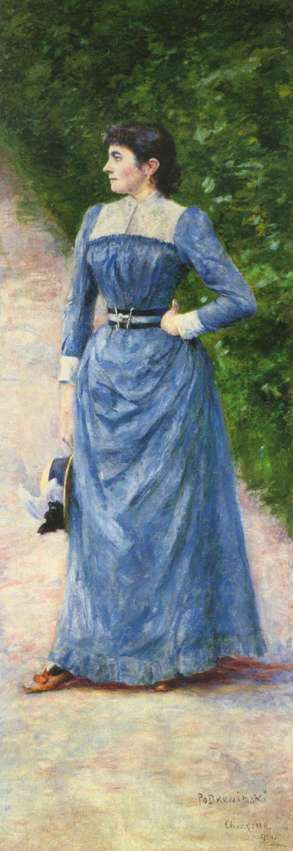 Podczas współpracy z magazynami Podkowiński dokumentował bieżące wydarzenia i ich uczestników, zwracając uwagę na zachowania jednostek. Rysował w konwencji właściwej latom 80. XIX w., zakładającej realizm, drobiazgowość, staranne wykończenie rysunku. Jednakże jego prace nosiły i znamiona indywidualizmu. Mianowicie wyróżniała je wrażliwość autora na światło. Choć oddawał się głównie twórczości ilustratorskiej na zlecenie, zainteresował się malarstwem akwarelowym i olejnym. W 1888 r. spędził wakacje w majątku Poschła w okolicy Garwolina, gdzie studiował krajobrazy właściwe prowincji. Owocem jego ówczesnej pracy jest „Ulica w Siennicy”. Obraz ujmuje wiejską rzeczywistość z pełnym zachowaniem postulatów realizmu, szczegółowo ukazując chłopów i ich chałupy. Niestety cechuje go sztywność i brak wyrazu. Na szczęście Podkowiński szybko wyzwolił się z tej maniery, czego dowodem jest dzieło „Wyjazd”. Stanowi ono zapowiedź dalszej twórczości malarza, związanej z impresjonizmem. Po powrocie z Paryża, latem 1890 r. artysta dostał zlecenie na ilustratorski reportaż w Ojcowie. Poza zamówionymi rysunkami przywiózł z tych okolic cykl impresjonistycznych akwarel. Rozkwit impresjonizmu w jego twórczości przyniosły kolejne dwa sezony letnie, w 1891 r. i 1892 r. Podczas nich spędzał czas u zaprzyjaźnionych rodzin Kotarbińskich i Maszyńskich w sąsiadujących ze sobą majątkach w Chrzęsnem i Mokrej Wsi. Malował w plenerze pejzaże, portrety i sceny wielopostaciowe, posługując się środkami właściwymi impresjonizmowi. Wybierając motyw do przedstawienia, nie kierował się tym, czy jest on odpowiednio malowniczy. Zamiast tego tak jak impresjoniści francuscy rejestrował codzienne otoczenie i zwyczajne wydarzenia. Analogicznie do nich interesowało go oddawanie zmienności plamy barwnej , wynikającej z różnego natężenia światła w różnych momentach dnia. Z czasem w jego obrazach było coraz mniej anegdoty. Ustąpiła ona miejsca efektom kolorystycznym i świetlnym, np. refleksom barwnym, jakie otoczenie rzuca na przedmiot czy zmianie barwy tegoż przedmiotu w zależności od oświetlenia. W 1892 r. skupił się na malowaniu niewielkiego fragmentu krajobrazu, najczęściej oglądanego nieco z dołu i w zbliżeniu. Dzięki temu zabudowywał całą kompozycję jednorodnie: tylko drzewami, tylko ziemią czy tylko łąką. Impresjonizm niósł dla Podkowińskiego znaczne możliwości rozwojowe, polegające na sięganiu po jeszcze bardziej nowoczesne rozwiązania. W 1893 r., malując pejzaże sandomierskie, np. w Wilczycach i Sobótce, nadał im syntetyczny, czyli uogólniony kształt. Poszczególnych elementów obrazu nie rozbijał już na plamy koloru, a traktował je w sposób bardziej uogólniony, szkicowy. Przestał ujmować szczegóły i wpływ zjawisk atmosferycznych. Zrezygnował także z fragmentaryczności ujęcia na rzecz ukazania panoramy widzianej z wysoka. Malował łany pól długimi pociągnięciami pędzla i spiętrzał je, podobnie jak wzgórza, oddając pagórkowaty krajobraz. Dukt jego pędzla zyskał większą wyrazistość. Co ciekawe, lata 1890-1895 jego twórczości cechuje dwutorowość, ponieważ tworzył wtedy i dzieła impresjonistyczne, i symboliczne. W 1890 r. namalował równocześnie impresjonistycznie barwne „Kobiety przy bilardzie” i monochromatyczne (czyli utrzymane w różnych odcieniach jednej barwy) „Zaduszki”. Obok pogodnych „Mokrej Wsi”, „Dzieci w ogrodzie” i „Sadu w Chrzęsnem” z 1892 r. powstał makabryczny „Taniec szkieletów”, a obok emanujących słońcem „Stawu w parku” i „Brogu” z 1894 r. ponury „Marsz żałobny Chopina”. W ciągu swojej działalności Podkowiński przejawiał więc i wnikliwość naturalisty, i wrażliwość romantyka. Pozostawał czuły i na zjawiska zewnętrzne, zachodzące w przyrodzie, i na zjawiska wewnętrzne czy metafizyczne. Wymieniony „Taniec szkieletów” zwiastował narastanie w twórczości Podkowińskiego symbolizmu. Jego kulminację stanowi jeden z najsłynniejszych obrazów artysty, „Szał uniesień”. Zwrot w sztuce Podkowińskiego ku symbolizmowi badacze jego działalności artystycznej tłumaczą także niespełnioną miłością. Poczucie odrzucenia, izolowanie się towarzyskiego dotąd artysty od ludzi znalazło odbicie w jego twórczości, podobnie jak przeżycia związane z chorobą płuc. Niepokojące nastroje pozwalał mu bowiem wyrażać symbolizm. „Portret Wincentyny Karskiej” stanowi owoc pierwszego wakacyjnego pobytu artysty w Chrzęsnem i Mokrej Wsi. Zaproszenie wystosował do niego Julian Maszyński, z którym uczęszczał do Szkoły Rysunkowej. Dzięki niemu Podkowiński, rodowity warszawiak, z zapałem dokumentujący życie miejskie, mógł po raz pierwszy doznać rytmu życia w wiejskim dworze. Chłonął jego uroki, jednocześnie pracując nad obrazami. W 1891 r. wykonał „Portret Stanisławy Maszyńskiej”, ujmujący całą sylwetkę kobiety w wąskim kadrze identycznie jak na „Portrecie Wincentyny Karskiej”. Jednak Maszyńską w przeciwieństwie do Karskiej malarz przedstawił we wnętrzu.