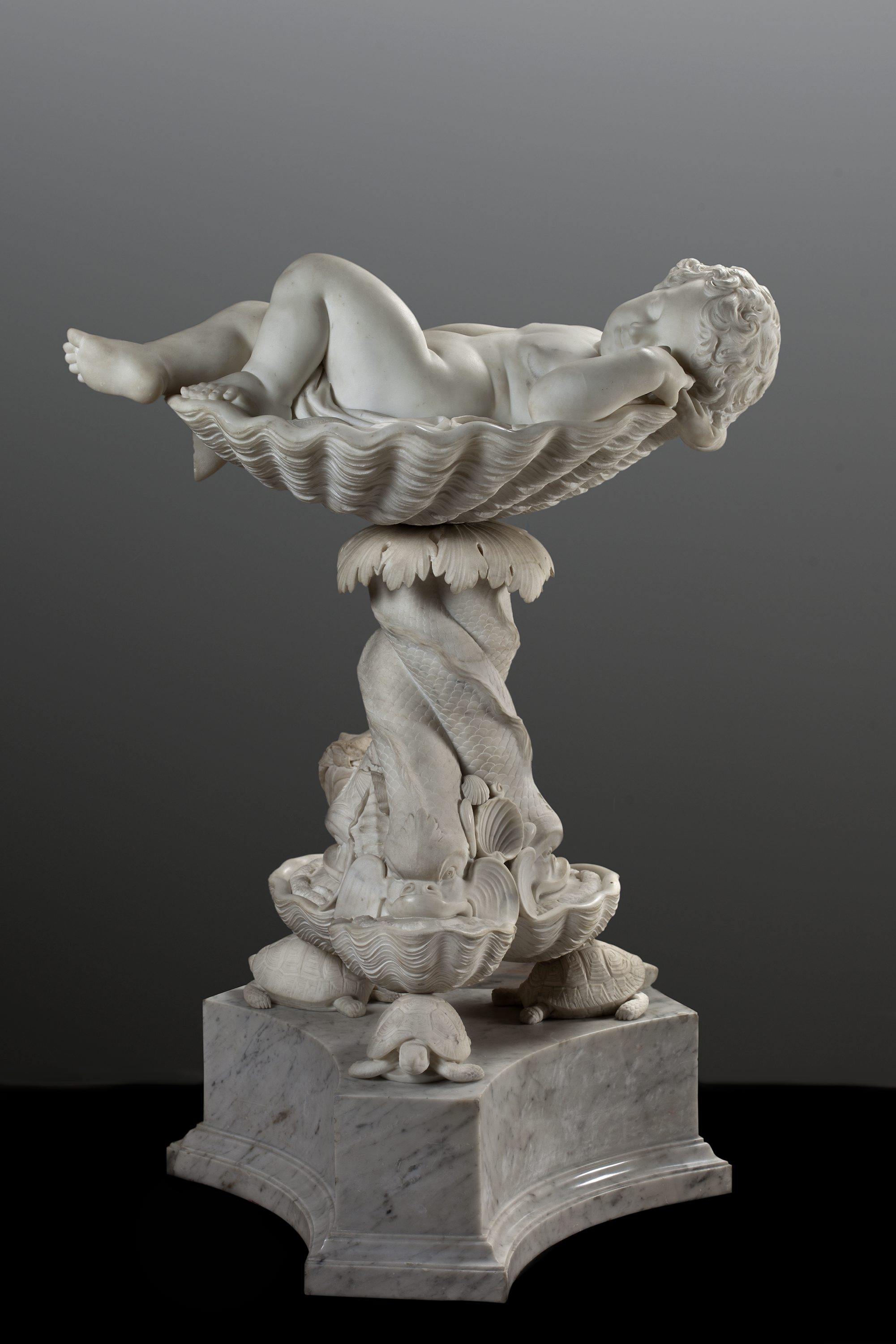 Brodzki wykonał rzeźbę z dużą pieczołowitością, każdy z motywów składających się na grupę Amora śpiącego w muszli został odkuty z ogromną precyzją: muszle są zdobione falistymi żłobieniami, ciała delfinów pokryte drobnymi łuskami, a skorupy żółwi mają na sobie geometryzującą siatkę. Praca ta jest jedną z charakterystycznych dla Brodzkiego rzeźb o tematyce mitologicznej. Artysta był typowym akademikiem – jego rzeźby są wymuskane, dokładnie opracowane, wykończone, poddane zasadom stosowności i akademickim rygorom piękna. Brodzki czerpał inspiracje ze sztuki późnego renesansu. Charakterystyczne dla niej formy i sposoby interpretacji ciała ludzkiego oddawał bez znamion zbędnego naśladownictwa – odkuwając postaci ludzi czy figury zwierząt bystrze obserwował naturę. Przez badaczy uznawany jest za mistrza dłuta, który w doskonały sposób poznał marmur, materiał w którym stworzył najwięcej kompozycji.