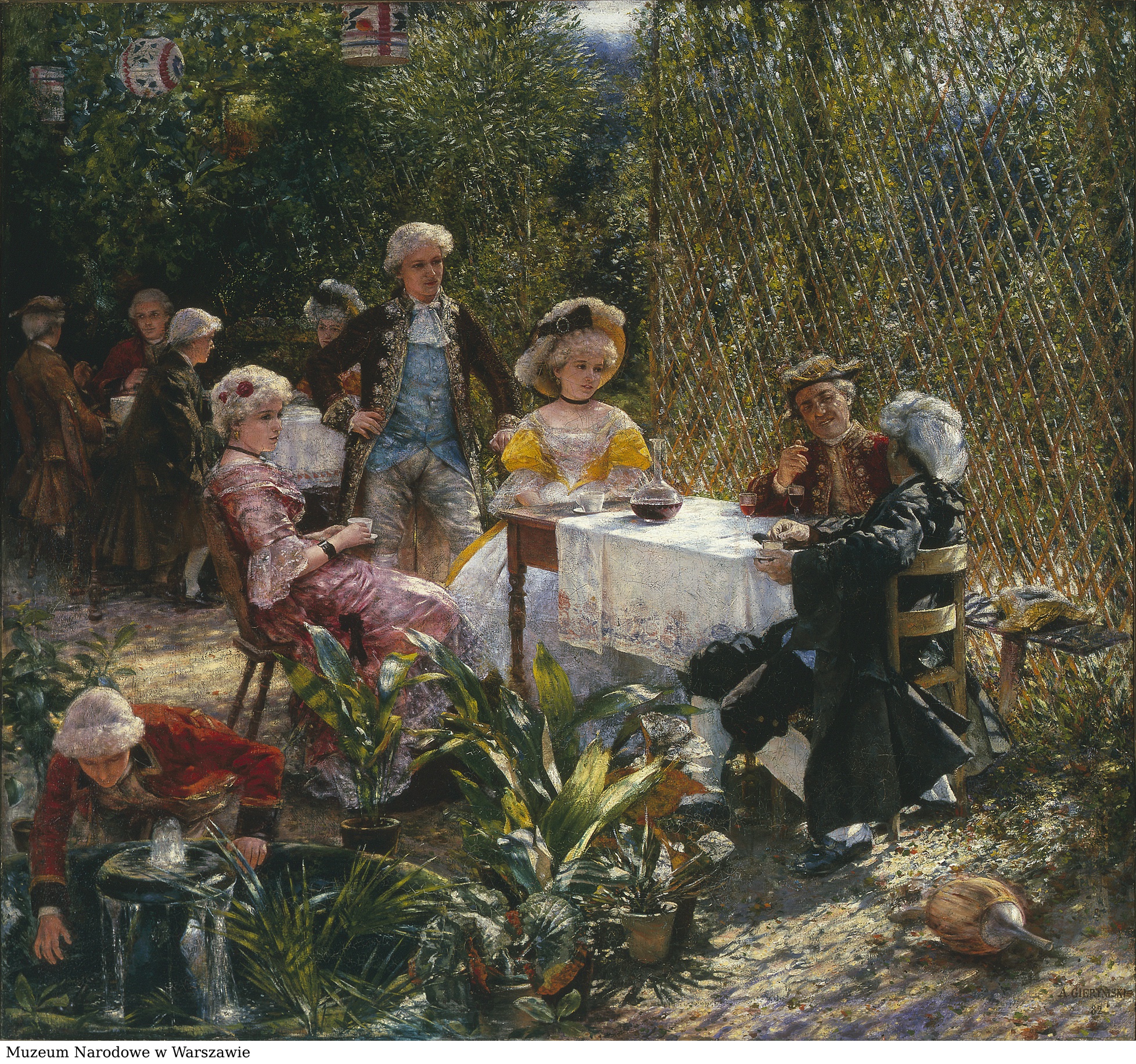 Na temat swojej pracy Gierymski wybrał scenkę rodzajową rozgrywającą się w słoneczny dzień w ogrodzie. Format płótna to prostokąt zbliżony do kwadratu o wysokości 135,5 cm i szerokości 148 cm. W centrum kompozycji artysta umieścił grupę pięciu osób dookoła stołu. Sam stół usytuowany jest na prawo od osi obrazu, skierowany ukośnie w lewo. Jego blat jest prostokątny, nakryty w do ¾ długości białym obrusem z kolorowym haftem na brzegach. Na stole stoją biała filiżanka ze spodkiem, szklana karafka napełniona do połowy czerwonym winem oraz dwa kieliszki z tym samym trunkiem. Jak wspomniano wcześniej, przy stole znajduje się pięć osób. Najbardziej na lewo wysunięta jest siedząca przy końcu stołu na drewnianym krześle młoda kobieta, ukazana bokiem, zwrócona w prawą stronę. Ubrana jest w różową suknię, a na głowie – zgodnie z rokokową modą – nosi białą perukę z upiętymi lokami i wpiętymi w nie dwoma kwiatami czerwonej róży. Kobieta plecy opiera na oparciu krzesła, w dłoniach trzyma białą filiżankę na spodku. Na prawo od niej, w geometrycznym centrum płótna, za węższą krawędzią stołu na krześle siedzi młoda kobieta zwrócona frontalnie, z głową odwróconą w ¾ w prawo. Ubrana jest w żółto-białą suknię, na głowie ma podobną do wcześniej opisanej perukę oraz żółty kapelusz zsunięty na tył głowy. Lewą stronę ronda kapelusza ozdabia czarna kokarda, z której wychodzą dwa białe pióra. Pomiędzy kobietami stoi młody mężczyzna – swoją lewą rękę opiera na oparciu krzesła damy w żółtej sukni, drugą trzyma na biodrze. Ukazany jest frontalnie, głowę zwraca w ¾ w prawo. Ubrany jest w ciemnobrązowy frak (okrycie wierzchnie z charakterystycznym wydłużonym, rozciętym tyłem) z białymi haftami na brzegach i mankietach, błękitną kamizelkę, znad której wystaje biały koronkowy żabot i jasne, kremowe spodnie. Na głowie ma białą perukę związaną na karku ciemną wstążką. Cała trójka patrzy na dwóch mężczyzn znajdujących się po drugiej stronie stołu. Pierwszy z nich siedzi po prawej stronie, za stołem. Jest w średnim wieku ubrany w czerwony frak ze złotymi haftami. Na głowie ma białą perukę oraz tzw. kapelusz trójgraniasty – nakrycie głowy, którego brzegi podgięte są z trzech stron w górę, tworząc trzy rogi. Kapelusz jest czarny, ozdobiony na brzegach złotym haftem. Mężczyzna siedzi na prostej, drewnianej ławie, której fragment widoczny jest po prawej stronie stołu. Swój prawy łokieć opiera na stole, dłoń ma podniesioną, jakby w połowie wykonywania gestu. Jego głowa jest lekko przechylona w lewo, patrzy na rozmówcę. Ten jest odwrócony w ¾ tyłem do widza. Siedzi bokiem na prostym drewnianym krześle, lewą rękę opiera na oparciu, prawą na stole. W dłoniach trzyma papierośnicę. Ubrany jest w czarny płaszcz o szerokich rękawach, czarne spodnie do kolan, białe pończochy i czarne buty. Na głowie ma białą perukę. Jego zdjęty kapelusz leży na ławie po prawej stronie. Wszystkie osoby przy stole wydają się zachowywać bardzo swobodnie, pogrążone są w towarzyskiej konwersacji. W głębi po lewej stronie, skierowany ukośnie w lewo znajduje się drugi stół nakryty białym obrusem. Siedzi przy nim trzech mężczyzn i jedna kobieta w strojach podobnych do wcześniej opisanych. Przez całą szerokość obrazu za stołami ukośnie od prawej do lewej strony rozciąga się treliaż altany, czyli ścianka w formie drobnej, drewnianej kratownicy z przerwą za plecami damy w żółtej sukni. Za kratą widoczna jest bujna zieleń, drobne listki roślin przeplatają się z listewkami. Od drewna i liści odbijają się drobne plamki światła, sprawiając wrażenie rozedrgania, wibrowania. Na pierwszym planie, w lewym dolnym rogu kompozycji znajduje się niewielka kamienna fontanna, z której tryska woda. Pochyla się nad nią ukazany frontalnie młody mężczyzna w czerwonym fraku z czarnym kołnierzem i mankietami oraz białej peruce na głowie. Młodzieniec klęczy na ziemi, lewą ręką opiera się o brzeg fontanny, prawą sięga po butelkę wina chłodzącą się w zbiorniku. Dookoła fontanny ustawione są rośliny w glinianych doniczkach. Ich zielone, lśniące liście to dla malarza kolejny pretekst do ukazania odbić światła.
