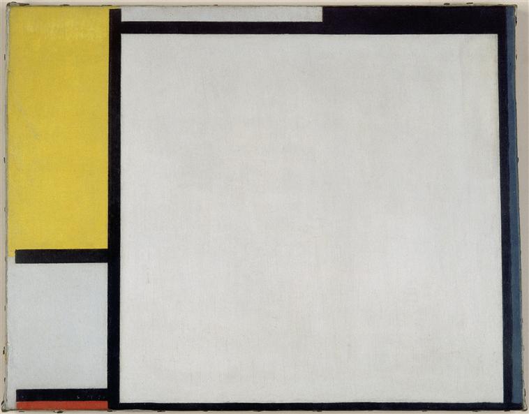 Zatrzymajmy się teraz nad Kompozycją w kolorze czerwonym, żółtym i niebieskim. Wyobraźmy sobie poziomo zorientowane, prostokątne płótno zbliżone do kwadratu. Wzdłuż prawej krawędzi płótna, ciągnie się bardzo wąski niebieski prostokąt. Od niego przesunięty lekko na prawo, duży biały kwadrat ujęty czarnymi liniami i zajmujący większą część płótna. Ponad górną linią określającą kwadrat, znajduje się wąskie pasmo, długi i bardzo niski prostokąt. Jego prawa nieco krótsza część, , pomalowana została na czarno, lewa na biało. Lewa strona kompozycji wydzielona jest grubą, czarną linią, pokrywającą się z lewym bokiem kwadratu. Wąski margines między krawędzią płótna, a lewym bokiem kwadratu wypełniają trzy prostokąty różnej wysokości, rozdzielone dwoma bardzo krótkimi czarnymi liniami. Na dolnej biały monogram artysty i data „PM 22”. Pod linią wąski i niski prostokąt w kolorze czerwieni, tuż nad nim, sięgający niemal do połowy płótna biały prostokąt. Nad górną czarną linią, najwyższy wąski prostokąt o barwie żółtej.