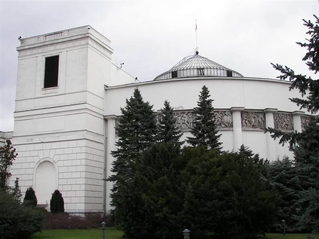 W latach 1918-1919 na potrzeby siedziby Sejmu odrodzonego państwa zaadaptowano gmach Aleksandryjsko-Marjańskiego Instytutu Wychowania Panien. Pomieszczenia budynku okazały się jednak niewystarczające dla najważniejszej instytucji państwowej. Stąd też, w 1925 roku, architektowi i kuratorowi Zamku Królewskiego w Warszawie Kazimierzowi Skórewiczowi zlecono opracowanie projektów przebudowy gmachu. Prace budowlane zostały ukończone w marcu 1928 roku. Najbardziej rozpoznawalną częścią kompleksu sejmowego jest dobudowana wówczas Sala Posiedzeń – monumentalna półrotunda dostawiona od południa, opięta rzędem żłobkowanych górą półkolumn, które na osi środkowej rozdziela łącznik pełniący funkcję [palarni i prowadzący do hotelu sejmowego.  Konstrukcja półrotundy poprzez wsparcie na półkolumnach, zyskała formę odnoszącą się do antycznego monopterosu. Odwołania do architektury antyku grecko-rzymskiego nie są tu przypadkowe. Formy klasycyzujące oparte na wzorach antycznych, przez stulecia traktowano jako właściwe dla budowli królewskich, państwowych, rządowych. Język architektury antycznej, kojarzony z porządkiem, rytmem i symetrią był językiem władzy. Skórewicz zinterpretował go na wskroś nowocześnie, nie zatracając jednak tych uniwersalnych konotacji.