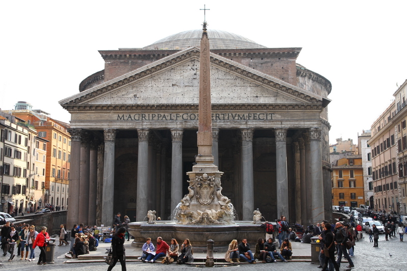 Panteon to najważniejsza rzymska świątynia długiego okresu pokoju imperium (lata 70-235), która cudem przetrwała do dnia dzisiejszego. Została wzniesiona w latach 118-128 przez cesarza Hadriana w miejscu, gdzie wcześniej stał pałac Agryppy z 27 roku p. n. e., którego śladem jest dedykacja zachowana we fryzie przedsionka. Doskonałość proporcji świątyni i mistrzostwa jej kompozycji pozwalają przypuszczać, że jej twórcą mógł być rzymski architekt syryjskiego pochodzenia Apollodoros z Damaszku, który jako inżynier wojskowy cesarza Trajana budował drewniane mosty wsparte na betonowych filarach, a potem wsławił się wzniesieniem Forum i Term Trajana oraz łuków poświęconych temu władcy w Benewencie i Ankonie. Był znany z projektowania założeń wykorzystujących doskonały kształt koła lub półokręgu, co widać w jego autorstwa odeonie na planie koła, przylegających do Forum hal targowych na planie półkola i Panteonie.