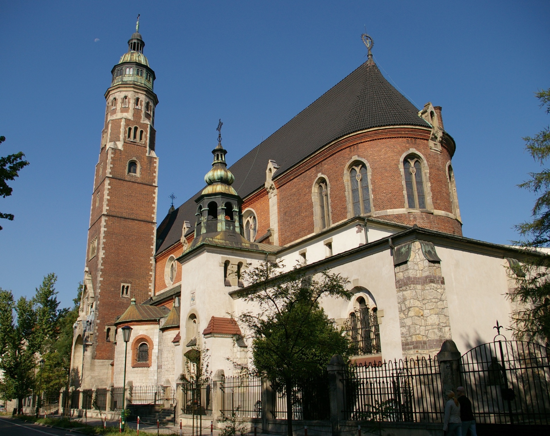 Bryła trójnawowego kościoła jak i jego kolorystyka wynikająca z zastosowania czerwonej cegły i szarobiałego kamienia, nawiązuje do gotyckiej architektury Krakowa. Świątynia jest wzniesiona bokiem wzdłuż ulicy co umożliwia oglądanie jej na całej długości. Stanowiąca dominantę budynku, ogromna wieża licząca prawie siedemdziesiąt metrów wysokości usytuowana jest przy wyniosłej fasadzie na przedłużeniu południowej nawy bocznej. W niej mieści się portal z wejściem głównym prowadzącym do kruchty, projektu Xawerego Dunikowskiego. Portal z umieszczonych jedna nad drugą dwóch ostrołukowych arkad. W górnej postać Jezusa Chrystusa z rospostartymi ramionami. Po bokach arkady proste figury adorujących wiernych. W ceglanej fasadzie na osi nawy głównej ulokowano kolejny portal z wejściem do kościelnej kruchty. Nad nim fasada została przepruta dużą rozetą. Pomiędzy połaciami wysokiego, dwuspadowego dachu trójkątne pole tworzy zwieńczenie fasady - tympanon. W nim cztery rzędy półkoliście zamkniętych okien, ułożonych piramidalnie od czterech na dole, przez trzy, następnie dwa i jedno u szczytu. Trójnawowy kościół ma tradycyjny układ bazylikowy, podobnie jak monumentalne, średniowieczne kościoły miasta. Jego najwyższa nawa główna jest wyraźnie wydobyta w bryle budynku. Jednolita linia dwuspadowego dachu ciągnie się nieprzerwanie nad nawą i zamykającym ją od wschodu prezbiterium. Wzdłuż nawy środkowej biegną znacznie niższe nawy boczne kryte dachami jednospadowymi - pulpitowymi. Wzdłuż nich półkoliste absydy mieszczące ołtarze boczne, ujęte po bokach prostokątnymi wnękami na konfesjonały. Kamienne romańskie apsydy, wyglądają jak części starszego kościoła wchłoniętego przez nowszą budowlę, lub samodzielnych kaplic z renesansowo-barokowymi hełmami. Wpisany w bryłę kościoła transept, czyli nawa poprzeczna oddziela nawę główną od prezbiterium, które zostało zamknięte półkoliście. Na końcach ramion transeptu czworoboczne dobudówki kaplicy i wieżyczki zwieńczonej hełmem z latarenką. Wieża dostawiona z boku fasady podobnie kryta hełmem z latarnią zakończoną krzyżem. Najwyższa kondygnacja wieży dwunastoboczna, niżej ośmioboczna, w dolnej części kwadratowa. Detale wykorzystane w elewacjach kościoła wykonane zostały z szarobiałego kamienia. Ich umiejscowienie jest typowe dla budowli historycznych (obramienia okien, narożniki ścian,nisza w portalu z wejściem głównym) ale ich formy mają charakter modernistyczny. Zaskakiwać mogą na przykład okrągłe okna umieszczone nad dachami pulpitowymi w bocznych ścianach nawy głównej, które w tradycyjny sposób wypełniają kamienne laskowania ażurowych maswerków, nawiązujące do gotyku. W nich wielobarwne kostki mozaiki tworzą herby polskich miast. Prezbiterium doświetlają okna zwieńczone półkoliście. Zastosowane przez Mączyńskiego rozwiązania jednoznacznie nawiązywały do wielowiekowej tradycji krakowskiej architektury, umiejętnie wpisując nowoczesną świątynię o modernistycznej formie rzeźb w historyczną tkankę miasta poprzez wykorzystaną do budowy czerwoną cegłę i białawy kamień.