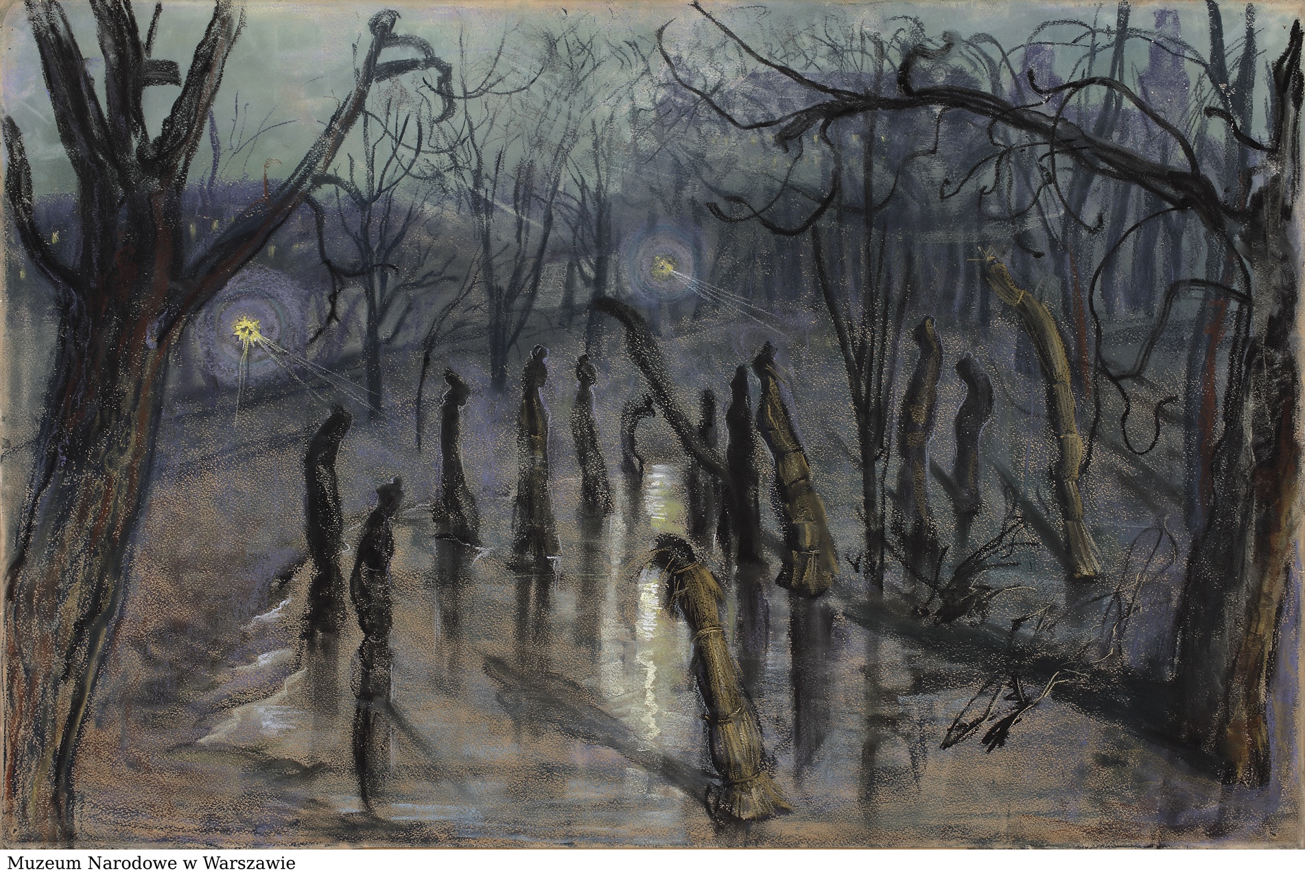 Obraz został namalowany pastelami na papierze o wymiarach 69 na 107 centymetrów, a powstał na przełomie 1898 i 1899 roku. To nie jedyny raz, gdy Wyspiański uwiecznił Planty w swojej pracy. Trudno się temu dziwić biorąc pod uwagę, jak ważną część miasta stanowią. Nie da się poruszać po Krakowie omijając ten wewnętrzny krąg, w ciągu dnia tętniący życiem, nocą nastrojowy, pełen tajemnic, dający pole do rozwijania wyobraźni. Na obrazie Wyspiańskiego niebo nad Plantami nie jest czarne głęboką nocą. To ten czas o zmroku lub tuż przed świtem, gdy wszystko trwa w zawieszeniu. Pozapalane latarnie świecą złotymi punktami kładąc swoje refleksy odbiciem na wodzie, której spora kałuża zajmuje środek dolnej połowy obrazu. Kręgiem w niej stoją słomiane chochoły, jak postacie smutnych tancerzy. Głęboko ukryte życie tkwi w nich, by uwolnić się z okrycia, gdy ciepły wiatr zawieje, a dzień stanie się dłuższy. Teraz, o chłodnym zmroku, stoją sczerniałe z pochylonymi głowami.