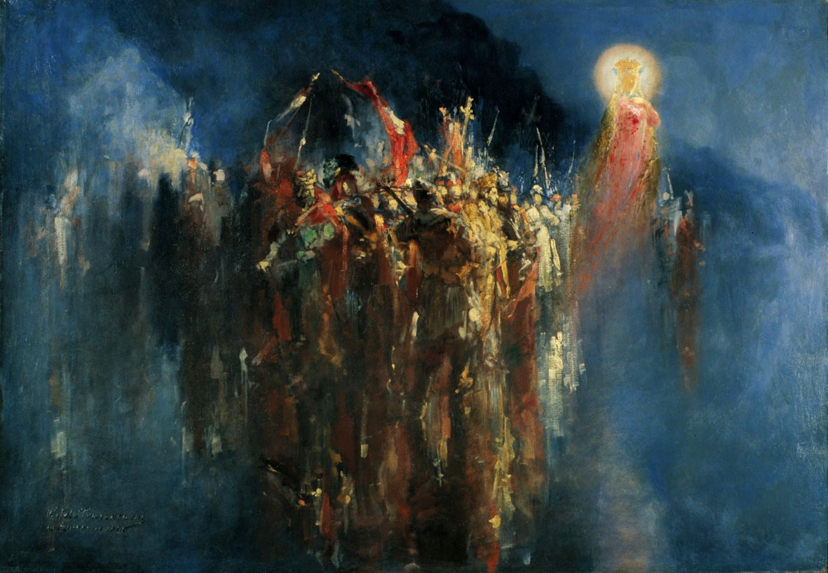 Fantastyczne przedstawienie ma swoje źródło literackie w poemacie romantycznego poety Zygmunta Krasickiego. Ten utwór z lat 40. XIX wieku składał się z naukowej analizy dziejów Polski oraz części poetyckiej, w której wątek losów narodu łączy się z historią o miłości. Podmiot liryczny poematu doświadcza wizji, w których doznaje objawienia dotyczącego przeznaczenia Polski. W związku ze swoimi cierpieniami ojczyzna miała zostać wywyższona przez Boga i odegrać ważną rolę w odrodzeniu duchowym ludzkości. Kompozycja malarska odnosi się do konkretnych wersów utworu o tłumie zjaw związanych ze stanem szlacheckim, w bojowym szyku kroczącym za Matką Boską, która ma doprowadzić tłum właśnie do rychłego zmartwychwstania – pokonania zła. Jest to wierna ilustracja słów poety, wydaje się, że słowa determinowały sposób, w jaki obraz został namalowany. Kraszewski określał korowód jako tańczące ogniki, pełzające po wodzie – tak samo namalowana grupa wydaje się nieuchwytna, ruchoma jak płomień świecy.