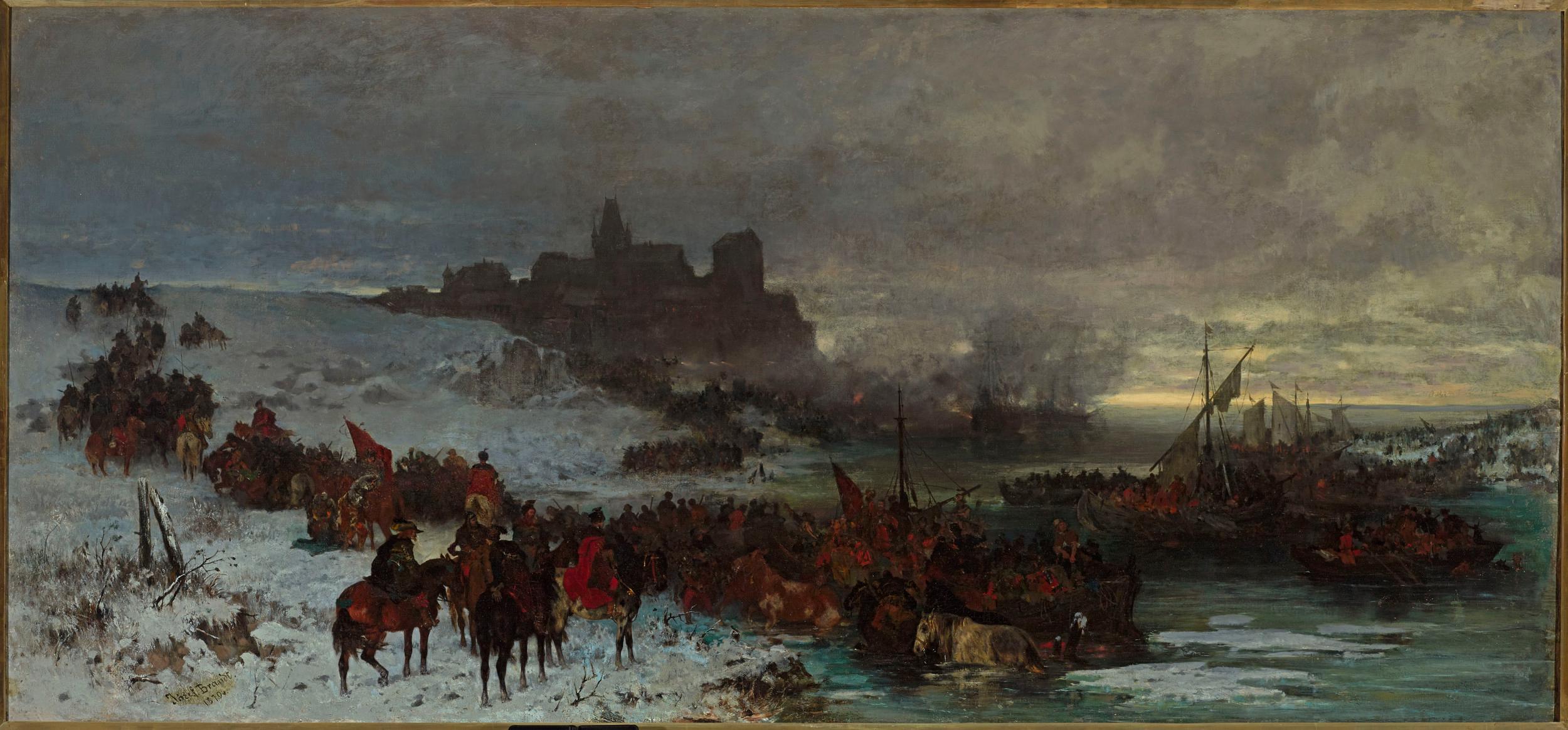 Scena przeprawy wojsk polskich na wyspę została ukazana w rozległym, panoramicznym pejzażu. Artysta uchwycił początek zwycięskiej operacji. Po lewej stronie obrazu ukazane zostało skaliste wzgórze zasypane śniegiem. Po prawej stronie Brandt namalował zatokę morza otaczającego wyspę; na wodzie widoczne są białe kry lodu. Na pierwszym planie znajdują się oddziały wojska, uchwycone jako wijąca się, półkolista wstęga. Część żołnierzy wspina się pod górę w stronę zamku widniejącego w głębi kompozycji; inni wybrali nieco krótszą drogę u podnóża pagórka, wzdłuż brzegów zatoki. Inni dopiero wychodzą z wody wraz z holowanymi przez siebie końmi, widocznymi po prawej stronie, tuż nad krawędzią płótna. Kolejni żołnierze na łodziach dopływają do brzegu – dostrzec można cztery łodzie z masztami i co najmniej trzy szalupy.