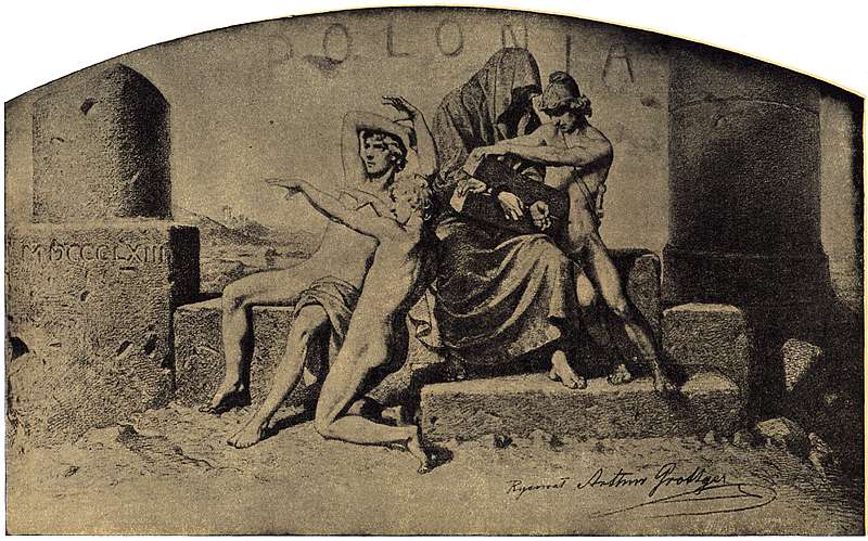 Przedstawienie widniejące na karcie tytułowej ma wymiar alegoryczny. Jak wszystkie kompozycje tego cyklu mieści się w leżącym prostokącie, którego górna krawędź jest zamknięta łukiem koszowym. Czteroosobowa grupa figuralna została ukazana na tle monumentalnej architektury. Dostrzec można fragment kolumny, schody, fragmenty postumentów. Na najbardziej masywnym, z postumentów, umieszczonym w centrum kompozycji, znajduje się napis „Polonia”. Narysowane przez Grottgera postaci znajdują się niemal w centrum kompozycji, są jedynie nieznacznie przesunięte w prawo. Figura Polonii została przedstawiona pod postacią siedzącej kobiety spowitej w obszerne szaty, której głowa i twarz są zasłonięte kapturem. Ręce kobiety są skute; z okowów uwalnia ją młody chłopak siedzący po jej prawej stronie. Na głowie ma czapkę frygijską, symbol wolności wywodzący się jeszcze z tradycji antycznej. Takie czapki zyskały ogromną popularność we Francji w dobie rewolucji. Na lewo od kobiety, nieco niżej, siedzą dwaj nadzy mężczyźni. Obydwaj są wyraźnie poruszeni, na ich twarzach rysują się silne emocje. Obydwaj patrzą nieprzytomnie przed siebie, wydają się wyobcowani z całej sceny, nieobecni w planie rzeczywistym. Komentatorzy twórczości Grottgera twierdzą, że scena ta łączy w sobie przeszłość, teraźniejszość i przyszłość. Ruiny, w których osadzona jest grupa figuralna, mają reprezentować przeszłość, świat i stary porządek, które właśnie legły w gruzach; zaś dwaj młodzieńcy wybiegają wzrokiem w przyszłość.