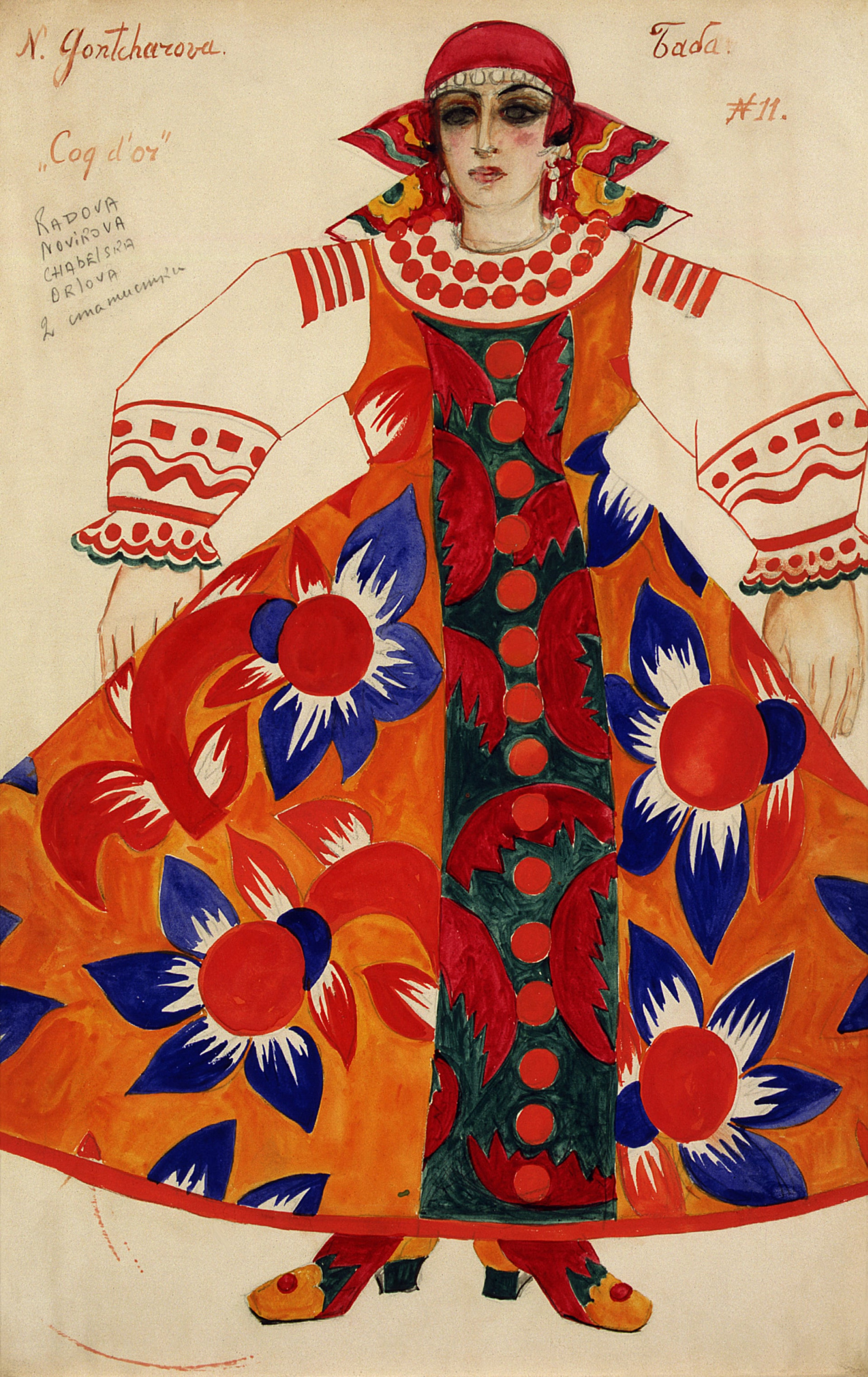 Scenografie i kostiumy Goncharovej zapewniły Diagilevowi ogromny sukces. Artystka nawiązała z nim długotrwałą współpracę, przeprowadziła się do Francji i już nigdy nie powróciła do Rosji. Przedsięwzięcie Diagileva, Balety Rosyjskie, nastawione było na kreowanie dzieł totalnych, Gesamtkunstwerken. Dzieł, których podstawą jest synestezja sztuk: malarstwo współbrzmi z teatrem, tańcem, poezją, muzyką. Diagilev jako impresario potrafił takie dzieła tworzyć. Goncharova nadawała im wschodni koloryt, przefiltrowany przez estetykę modernizmu. Skądinąd dyrektor Baletów doskonale wpisał się ze swoją ofertą w kulturalny pejzaż Paryża. Wyczuł ogromne zainteresowanie, jakim cieszyła się tam kultura rosyjska, zwłaszcza po sukcesie na Wystawie Światowej w 1900 roku. W 1906 roku zorganizował w Paryżu wystawę sztuki rosyjskiej oraz festiwal rosyjskiej muzyki. W wystawie wzięła udział także późniejsza autorka scenografii do Złotego kogucika.